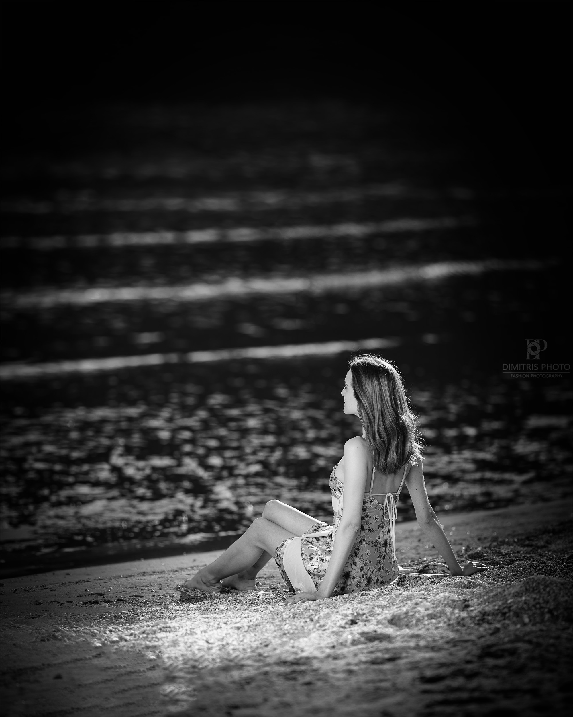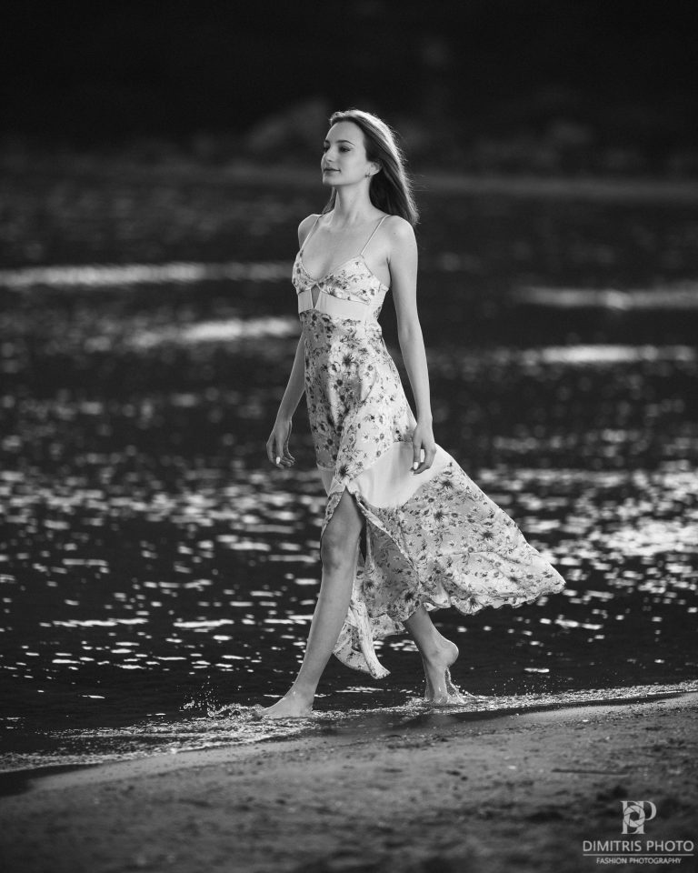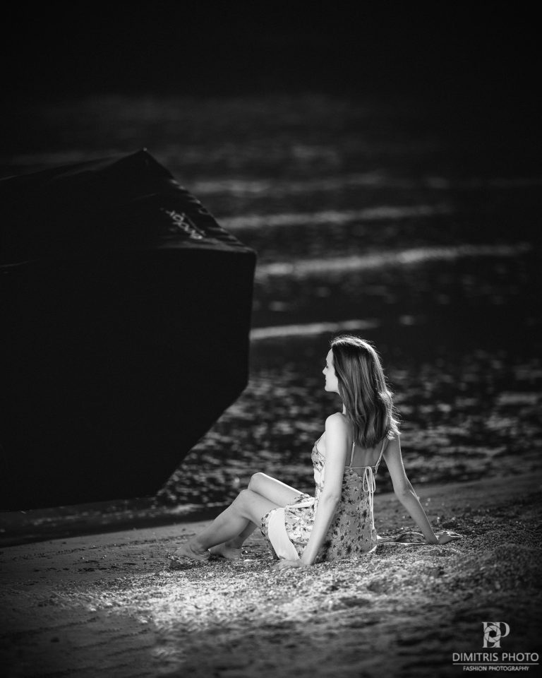 Επιλέξαμε να παρουσιάσουμε ένα μεγάλο μέρος της σειράς σε ασπρόμαυρο (B&W). Η αφαίρεση του χρώματος λειτουργεί ως μεγεθυντικός φακός για το συναίσθημα και τη σύνθεση. Οι λήψεις όπου η Μαρία περπατά στην άμμο ή κάθεται στην ακροθαλασσιά αποκτούν μια διαχρονική, σχεδόν νοσταλγική αξία. Η αντίθεση ανάμεσα στο σκούρο φόντο της θάλασσας και τις φωτεινές αντανακλάσεις του νερού δημιουργεί ένα δυναμικό “bokeh” που απομονώνει το μοντέλο, δίνοντας έμφαση στην κομψότητα της κίνησής της.