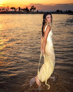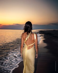 An editorial exploration of light and movement by the sea. The interplay between the silk-like texture of the wet fabric and the amber sky creates a timeless, high-fashion narrative. A tribute to the Mediterranean light.